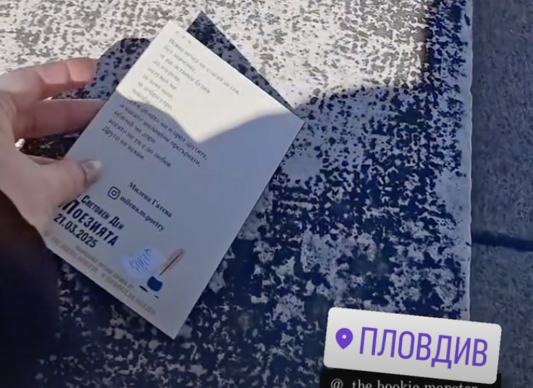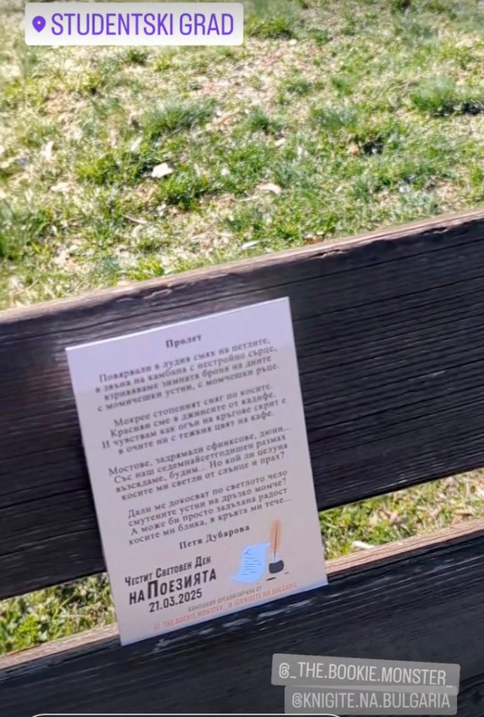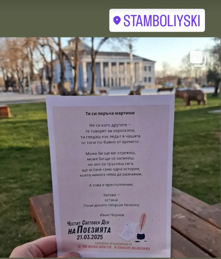 Принтирани стихотворения от български и световни поети бяха разпространени в няколко града из спирки, паркове, алеи по начин по който не нарушават градската среда, но подсещат че деня на поезията не забравен и че този стил продължава да има голяма значение за всички нас!